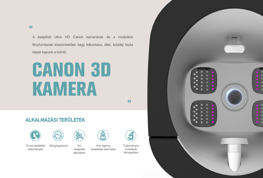 Az innovatív, hordozható bőrtónus detektorral megkapjuk a bőr színét a CMYK színtérben. Megvizsgálhatjuk és összehasonlíthatjuk az arc és a test különböző részeinek bőrtónusát. Értékelhetjük a bőrfehérítő kezelések eredményeit.