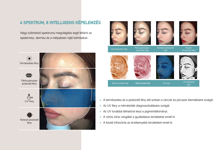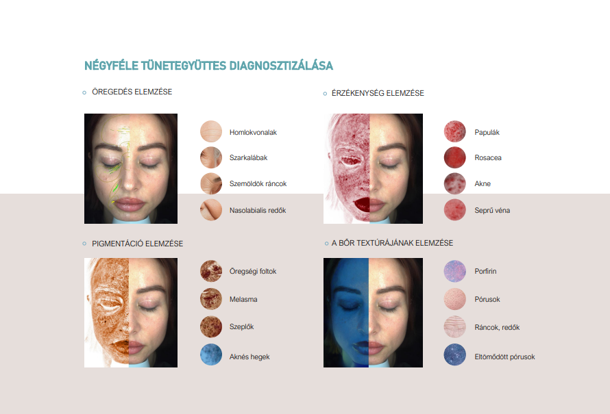 Öregedés, érzékeny bőr, pigmentáció, bőr textúra, bőr tónus diagnosztika – ezek mindegyikére tökéletes megoldást nyújt a Caldera Arcelemző gép!