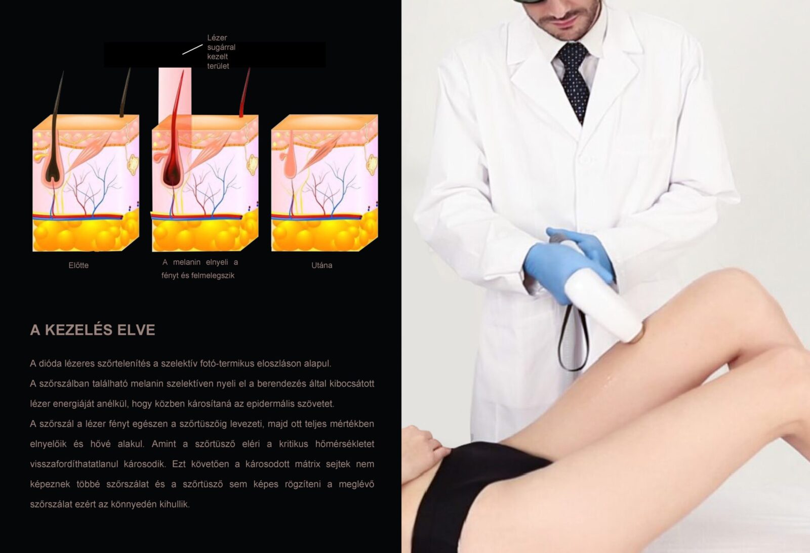 A dióda lézeres szőrtelenítő technológia a fény és hő szelektív dinamikáján alapul. A lézer áthatol a bőr felületén és eléri a szőr gyökerét. A dióda lézeres készülék 808nm/1064nm/755nm-es hullámhosszal dolgozik, mely hatékonyan célozza meg a szőrtüszőben lévő melanocitákat anélkül, hogy a környező szövetek károsodnának. A lézer fény elnyelődik a szőrszálban és szőrtüszőben lévő melaninban és hővé alakul, így megnöveli a szőrtüsző hőmérsékletét. Mikor a hőmérséklet kellően magasra emelkedik, visszafordíthatatlanul károsul a szőrtüsző szerkezete, amely eltűnik a szőr természetes fiziológiai folyamatai során, így tartós szőrtelenítést érhetünk el.