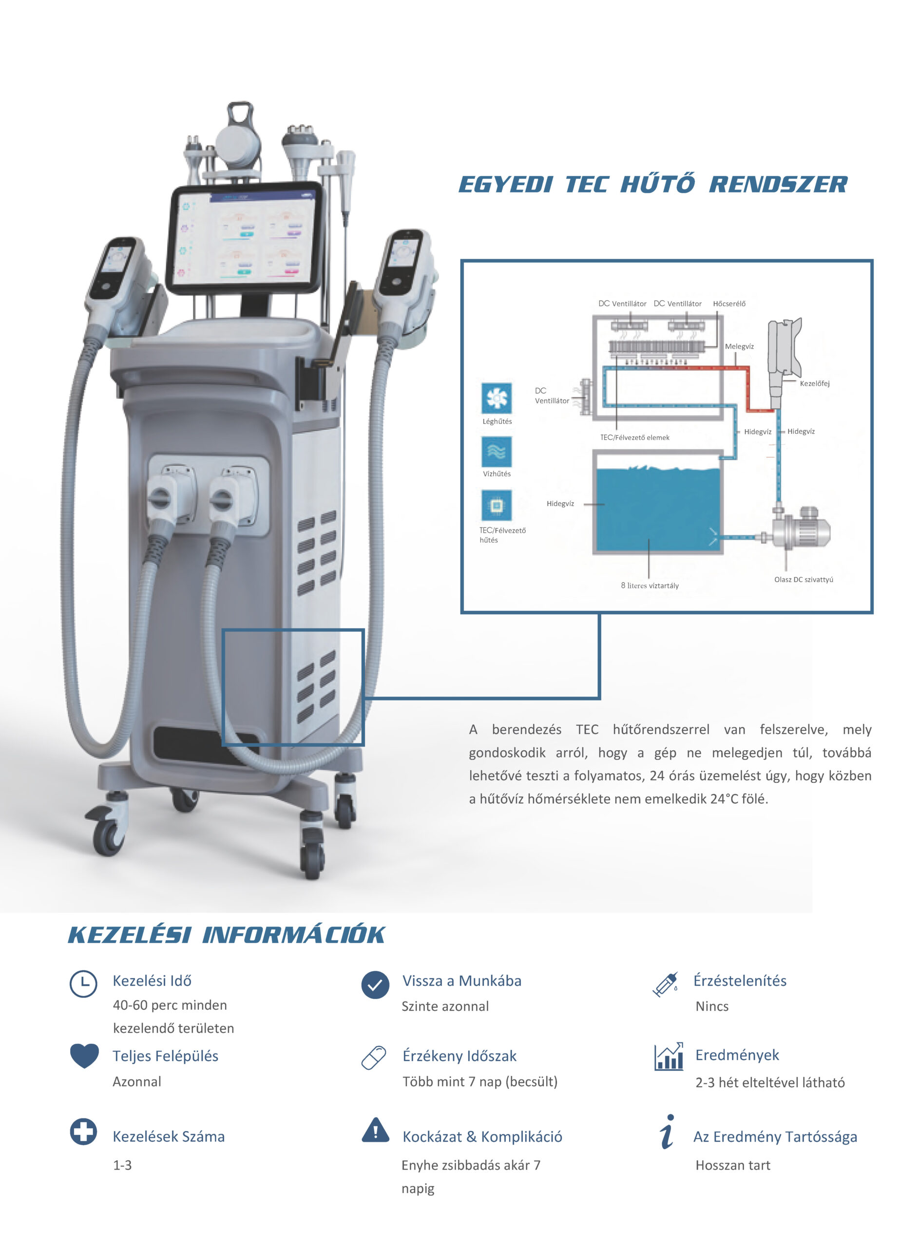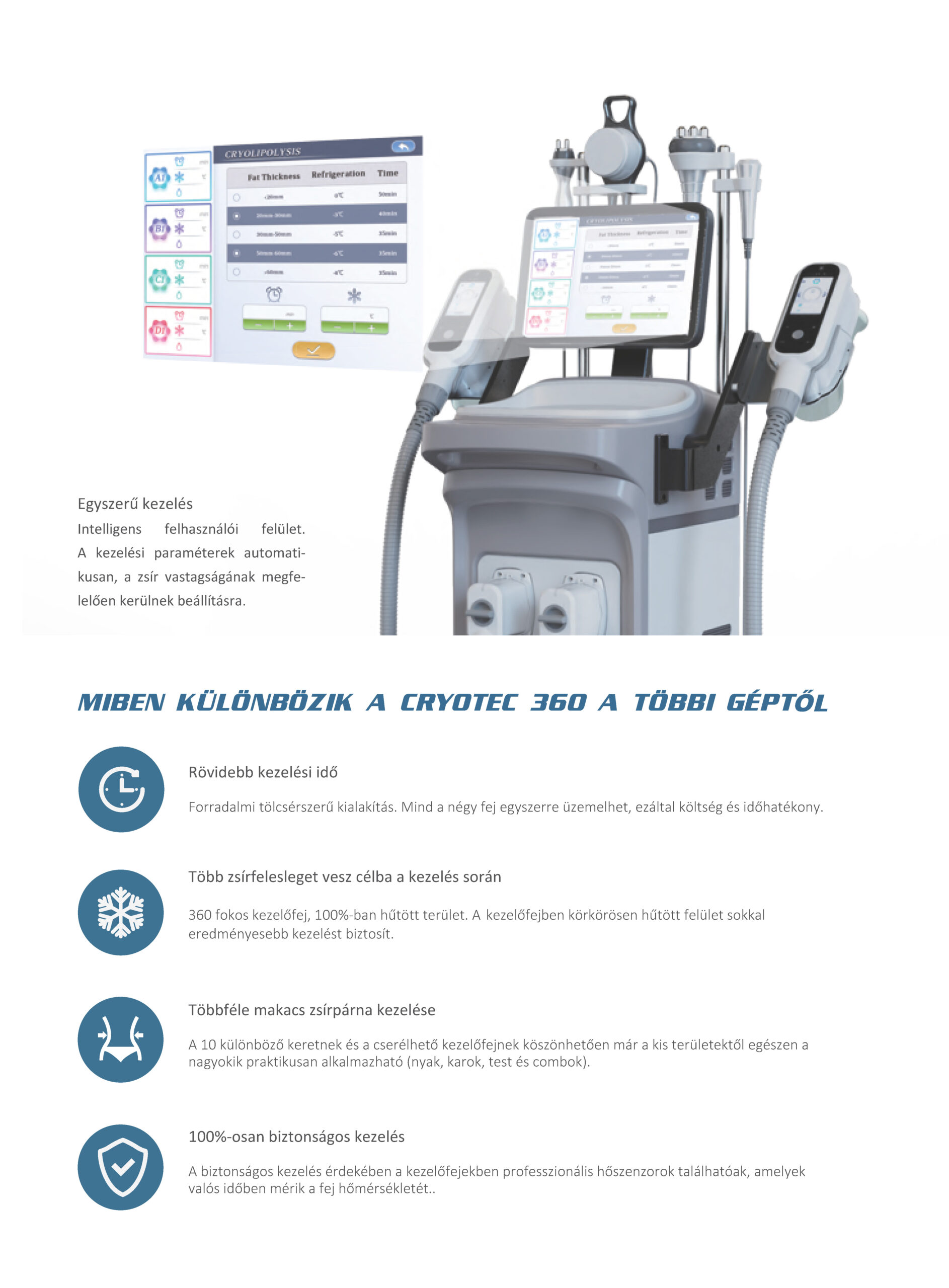 A cryolipolízis szabályozott, lassan csökkenő hőérzetet adó hatásmechanizmus, amely az egyenletes vákuumhatás mellett, maximálisan a kezelés végéig mínusz 5 fokig -sok esetben elegendő a +3 fok is- hűti a területet, már említetten szabályozott formában. Ezt minden körülmények között korlátozott tűrőképességű paciensek is bátran használhatják.