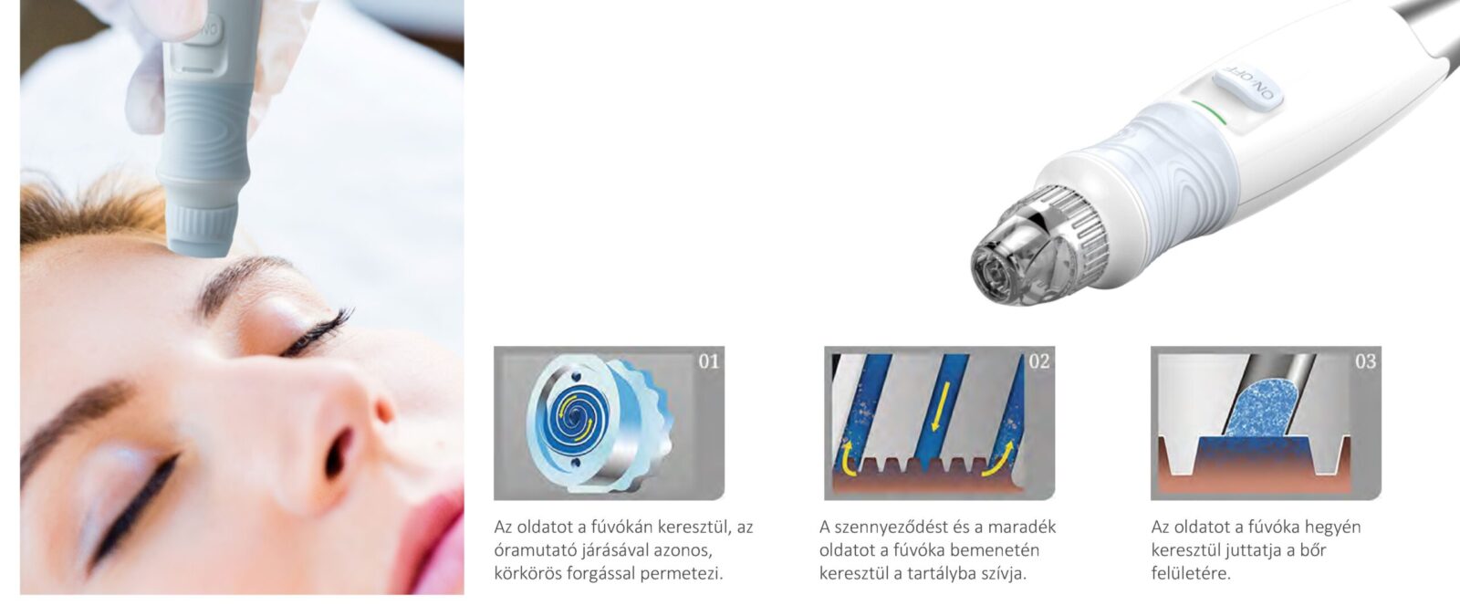 Számos fúvóka áll rendelkezésre. A felhasználó a bőr állapotához igazodó legoptimálisabb fúvókát választhatja.