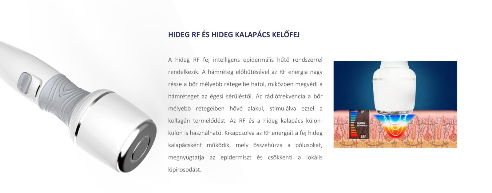 A hideg RF fej intelligens epidermális hűtő rendszerrel rendelkezik. A hámréteg előhűtésével az RF energia nagy része a bőr mélyebb rétegeibe hatol, miközben megvédi a hámréteget az égési sérüléstől. A rádiófrekvencia a bőr mélyebb rétegeiben hővé alakul, stimulálva ezzel a kollagén termelődést. Az RF és a hideg kalapács külön-külön is használható. Kikapcsolva az RF energiát a fej hideg kalapácsként működik, mely összehúzza a pórusokat, megnyugtatja az epidermiszt és csökkenti a lokális kipirosodást.