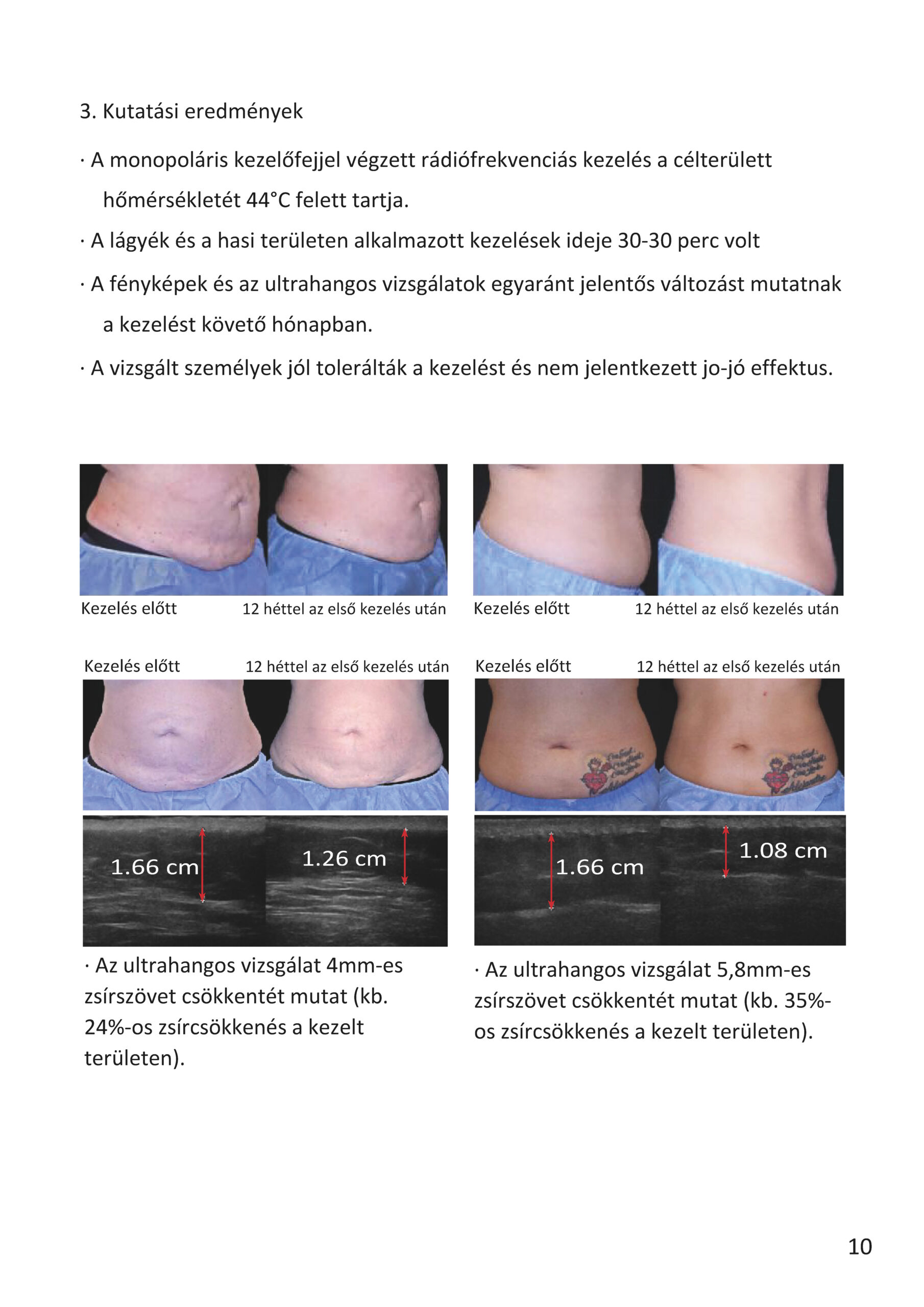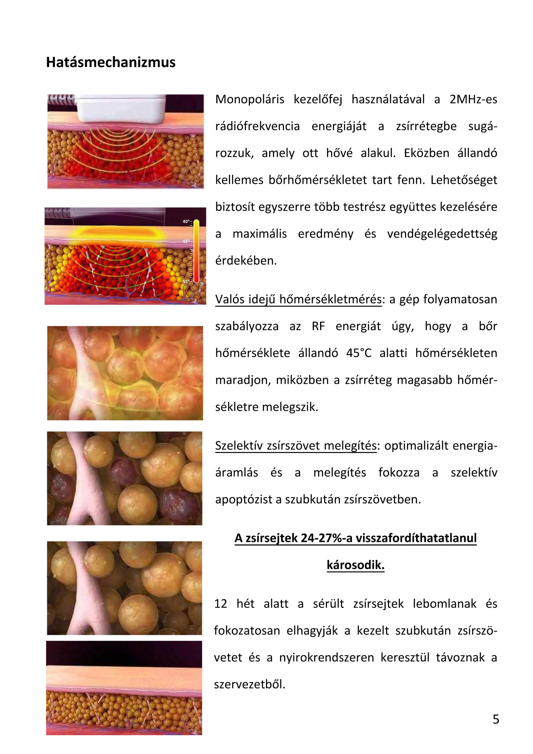 Ez egy non-invazív, kényelmes eljárás. A mono-poláris (RF) kezelőfej tetszőlegesen elhelyezhető, melynek köszönhetően az egész has és a különböző testrészek egyidejű kezelését is lehetővé teszi. Gyors, megbízható, kényelmes és klinikailag bizonyított, hogy tartósan eltávolítja a makacs zsírsejteket olyan területekről, mint a has, az oldalak, a karok, a lábak, az áll és a térd.